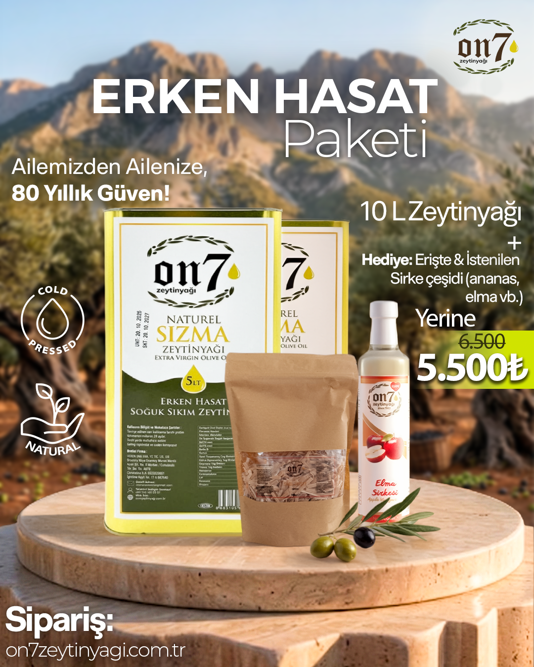 Zeytinin en taze, en yeşil ve antioksidan değerinin en yüksek olduğu dönemde özenle toplanıp bekletilmeden Soğuk Sıkım (Cold Pressed) yöntemiyle elde edilen On7 Erken Hasat Naturel Sızma Zeytinyağı, zengin meyvemsi aroması ve damakta bıraktığı hafif, tatlı yakıcılığı ile gerçek bir sağlık kaynağıdır. Özellikle çiğ tüketim, salatalar ve soğuk mezeleriniz için vazgeçilmez bir lezzet sunar. Tamamen doğal (Natural) yollarla üretilen yağımız, 80 yıllık köklü tecrübemizin bir eseridir.